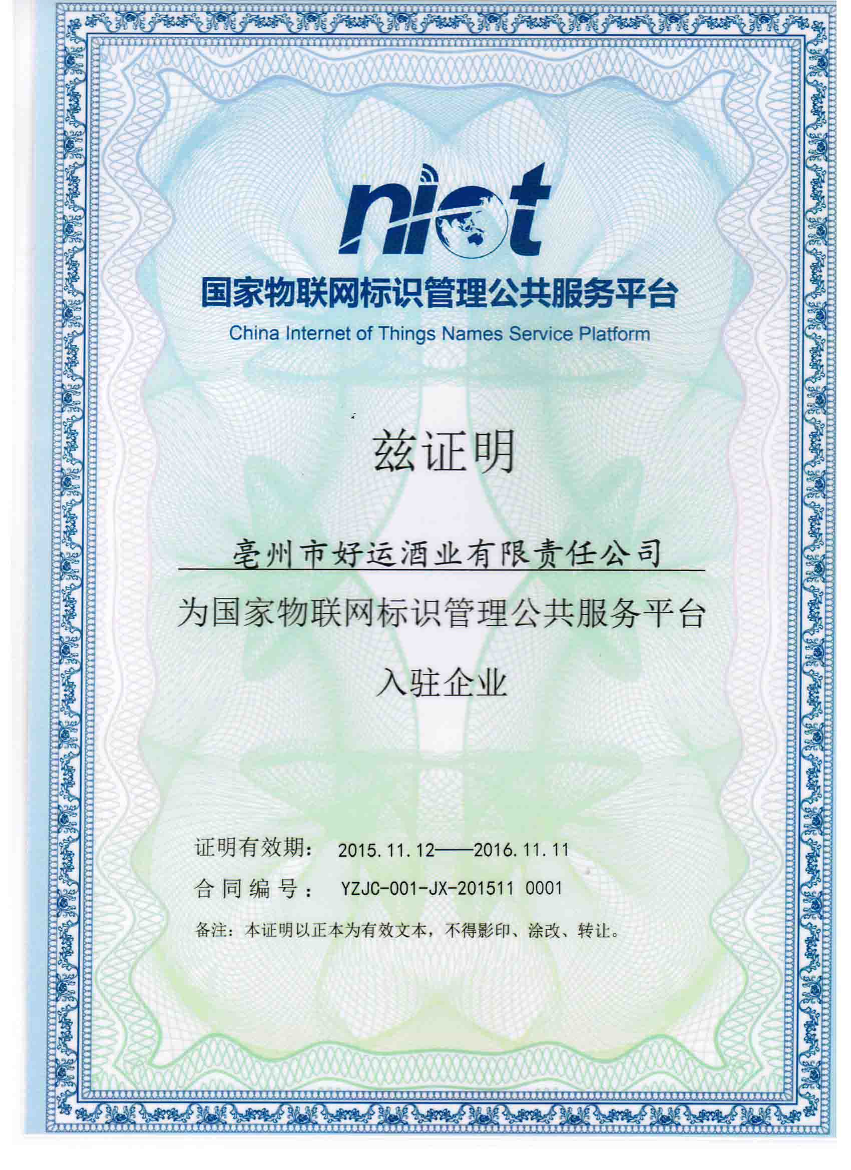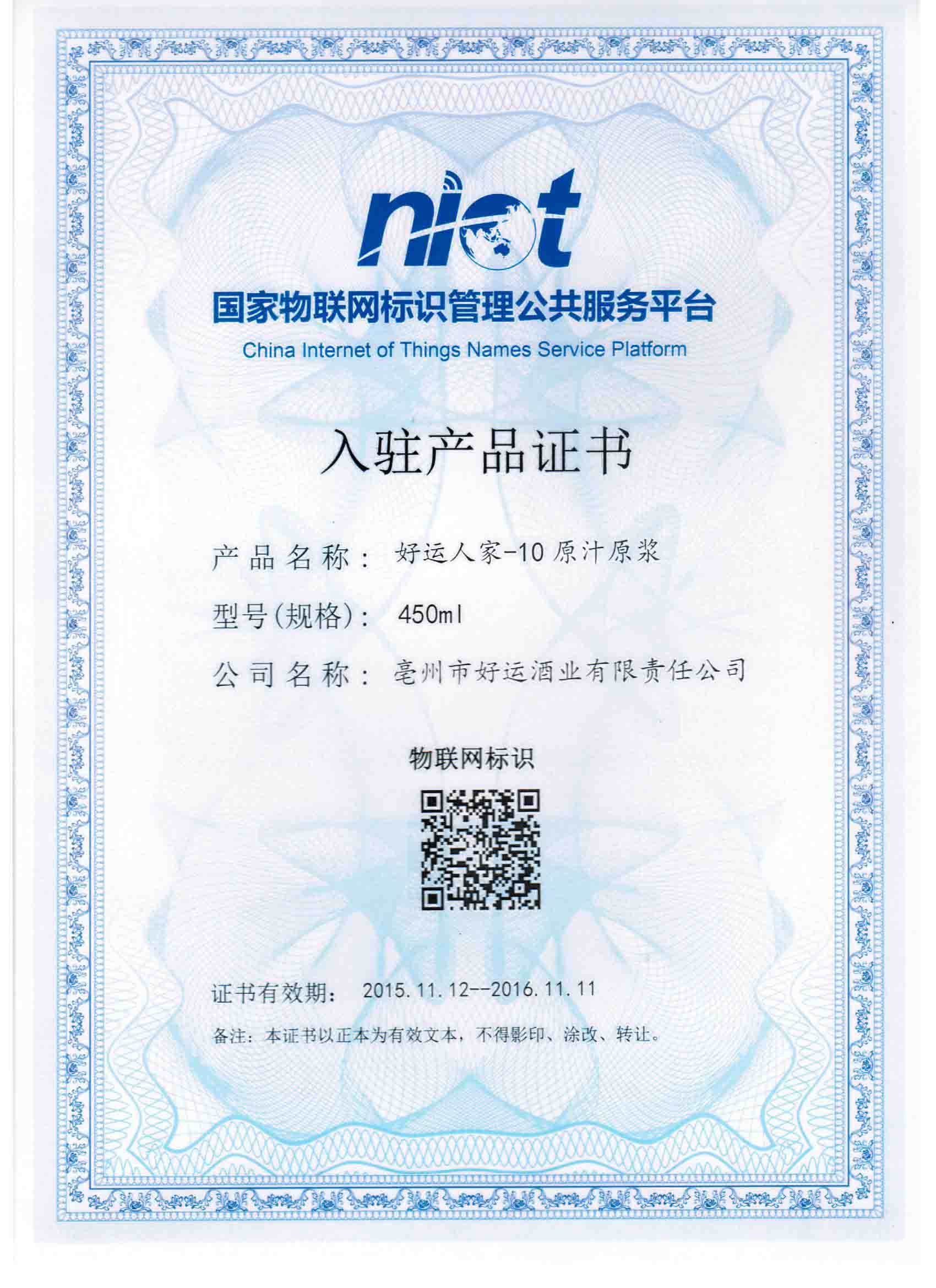 (好運(yùn)人家—10年原汁原漿)入駐國(guó)家物聯(lián)網(wǎng)